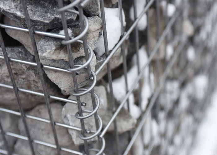 I canestri del gabbione che forniamo vengono come corredo confezionato piana che è montato facilmente nel cubo o nella gabbia rettangolare pronta per la ripiena/di pietra. I canestri della maglia sono confezionato piana spedito e vengono con i 6 lati del reticolato di saldatura a formare i falegnami della cerniera dell'angolo del cavo di spirale e del cubo. Riempito una volta di pietra/rocce richieste, i canestri del gabbione possono essere impilati sopra a vicenda per fornire un muro di sostegno stabile e decorativo in un giardino o in una posizione abbellita.